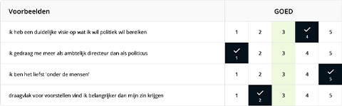 Op deze wijze vult u alle 5 vragen in. Controleer of voor elke uitspraak met een X als score is ingevuld. Lege regels mogen niet voorkomen. Dubbele scores per kolom zijn ook niet mogelijk.
