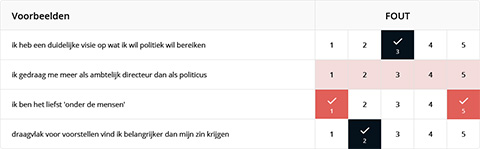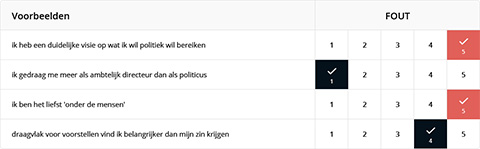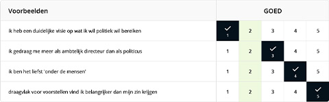 Op deze wijze vult u alle 5 vragen in. Controleer of voor elke uitspraak met een X als score is ingevuld. Lege regels mogen niet voorkomen. Dubbele scores per kolom zijn ook niet mogelijk.